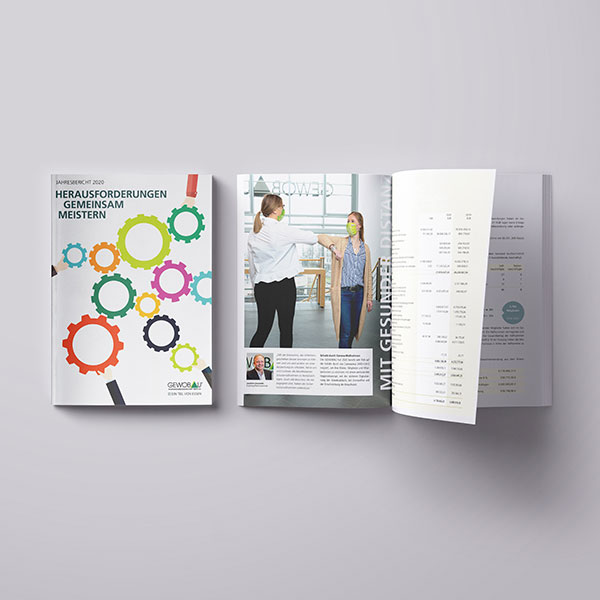 Die GEWOBAU Wohnungsgenossenschaft Essen eG (GEWOBAU) gibt die Konzeption und Gestaltung ihres Geschäftsberichts, genauer gesagt ihres Jahresberichts, seit vielen Jahren vertrauensvoll in die Hände des stolp+friends-Teams. Auch in diesem Jahr haben die wohnungswirtschaftlichen Kommunikationsspezialist:innen gemeinsam mit der GEWOBAU einen passenden roten Faden gefunden, der die lesende Zielgruppe durch das Geschäftsjahr der Wohnungsgenossenschaft führt: „Herausforderungen gemeinsam meistern“ ist das Motto. Großformatige Bilder und O-Töne von Mitarbeiter:innen, Mieter:innen und Wegbegleiter:innen geben interessante und authentische Einblicke in das herausfordernde Jahr 2020. Besondere Kennzahlen sind durch anschauliche Grafiken hervorgehoben, an denen der Blick beim Durchblättern hängenbleibt.