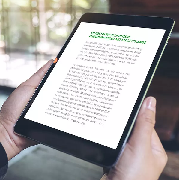 Bei der Realisierung eines internen Newsletters gibt es einiges zu beachten: die Wahl relevanter Themen, die Texterstellung, die Gestaltung im Corporate Design und die technische Umsetzung. Darum zählen Wohnungsunternehmen am besten auf die fachgerechte Unterstützung eines Branchenprofis – wie die Mettmanner Bauverein eG (MBV eG), die ihren Mitarbeiter-Newsletter von stolp+friends erstellen lässt.