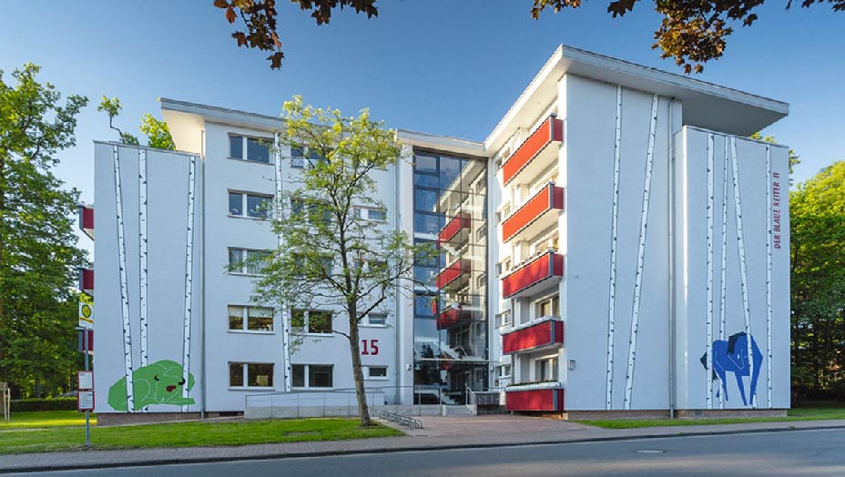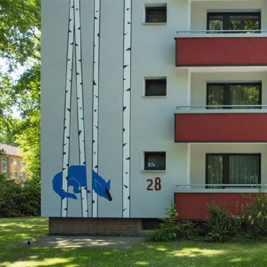 Bunte Schmetterlinge fliegen die Hauswand hinauf, filigrane Bäume wachsen an der Fassade in den Himmel hinein, ein blaues Pferd springt zwischen Birkenstämmen umher – die auffälligen Fassaden in der ostwestfälischen Stadt Espelkamp sind inzwischen zu ihrem Markenzeichen geworden.