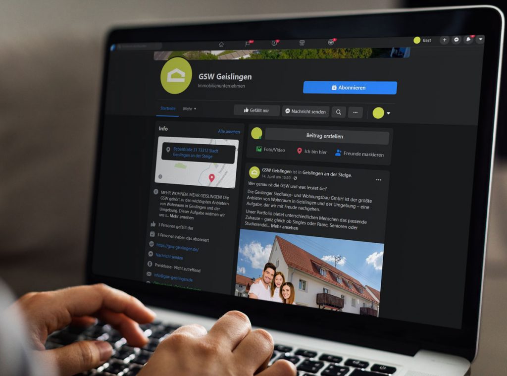 Um die Bekanntheit des Wohnungsangebotes zu steigern, modernisierte stolp+friends die Website des Unternehmens SEO-gerecht für ein besseres Google-Ranking, textet und gestaltet den Content für die neu geschaffenen Social-Media-Kanäle Facebook und Instagram. Damit auch abseits des Internets deutlich wird, wie umfangreich und vielfältig das Wohnungsangebot der GSW Geislingen ist, gestaltet stolp+friends außerdem die „Leuchttürme“ im CD des Unternehmens (Bestands- oder Projektmarkierung).