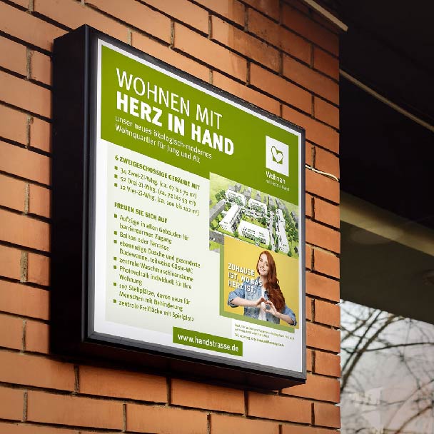 Grundlage der modernen Kommunikations- und Vermarktungsstrategie von stolp+friends war die Entwicklung und Gestaltung eines individuellen Quartierlogos sowie der Projekt-Website www.handstrasse.de, auf der ein Interessentenbogen, das Exposé sowie der Zugang zu einer virtuellen Wohnungsbesichtigung eingebunden war. Außerdem schaltete die RBS Anzeigen auf Facebook und Instagram sowie in Printmedien und informierte in Pressemitteilungen über den aktuellen Bau- und Vermietungsstand.