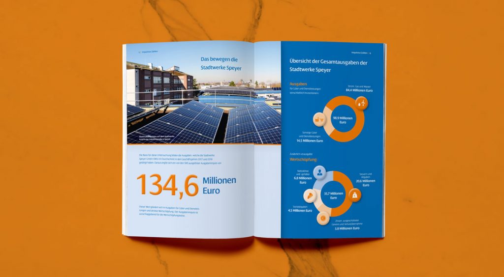 Den Stadtwerken Speyer war es ein Anliegen, ihren Einsatz für die Region zu kommunizieren. Darum analysierte das Pestel Institut die Daten des Versorgungsbetriebes im Rahmen einer Wertschöpfungsstudie – und stolp+friends bereitete die Zahlen anschließend ansprechend sowie verständlich für die breit gefächerte Zielgruppe auf.
